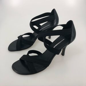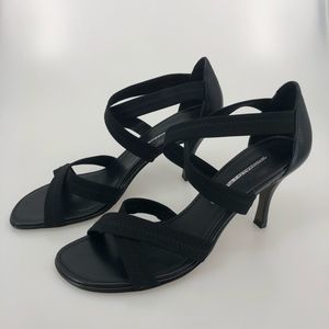 Beautifully classic sandals, can wear to dress up any outfit. Stretchy black crisscross bands across vamp and ankles, leather across heel and insole. 3 1/4” heel.