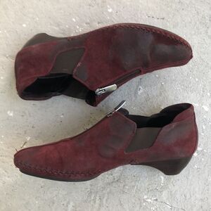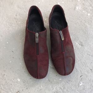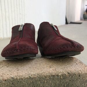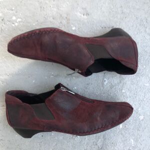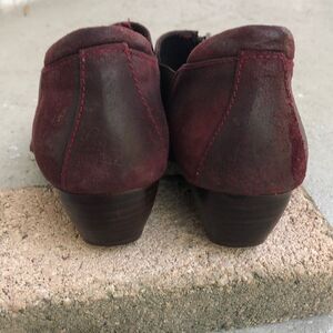 Soul is stamped peace for the children. Color is like a burgundy eggplant, Have a distressed look to them. In great condition and super comfortable. Heel height is 1.5.