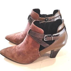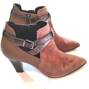 Donald J Pliner Tamy Heeled Ankle Boots in Taupe/Brown leather and suede with a copper metallic leather adjustable strap. Pointed toe, side cutouts, inside side zipper, padded insole and leather and rubber outer sole. 3" stacked heel. Gorgeous leather ankle boots in a size 6.5.