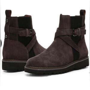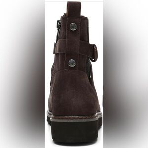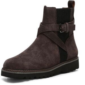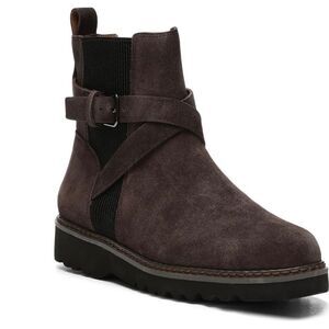 A lug sole lifts this pull-on bootie with a sleek shape and buckled accents.