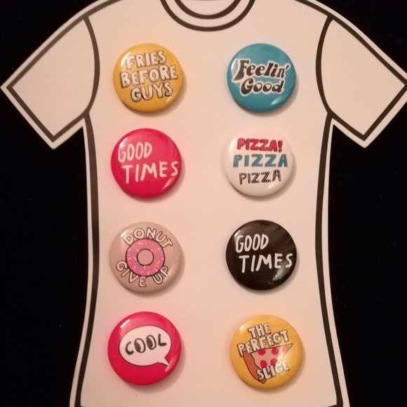 For sale is a package of 8 awesome, retro-style, from the 80's bittpns. Each button is an inch in diameter and closes by tucking the pin back into the holder.