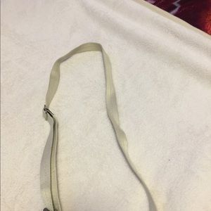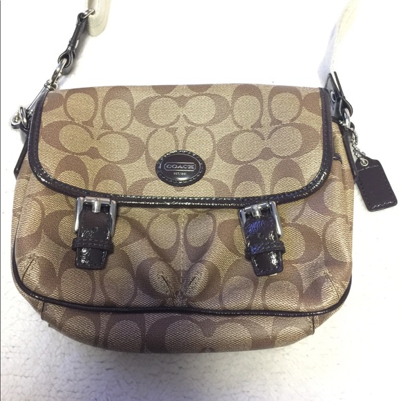 Small brown with signature pattern cross body bag. Barely worn. Like new. Cream clothed adjustable strap. About a two foot strap drop. One inside zippered pocket. Two other pockets under the flap and one open pocket in the back.