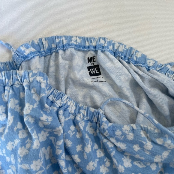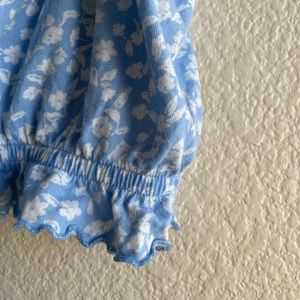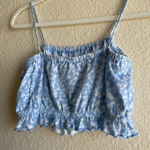 Pacsun crop, sky/baby blue with white flowers and ruffled bottom Super comfy and synched for flattering look
