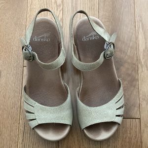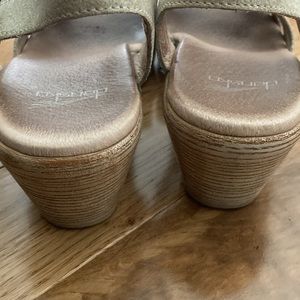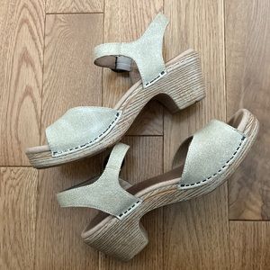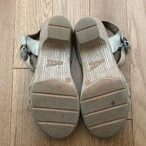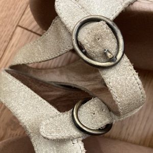 I wear a 36 but wore 37 during pregnancies. These were only worn in the office or at church. Most visible wear is at the buckles. Excellent condition. Neutral color I believe called oyster on the website. Flattering on the feet, very feminine. Looks good with jeans or dresses!