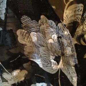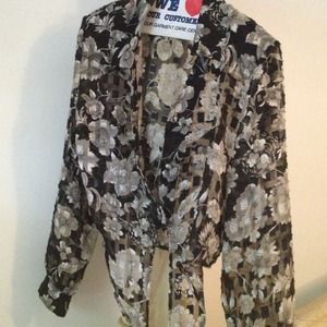 Button down with tie closure long sleeve cool for summer pretty sparkly white black flower pattern