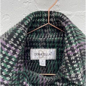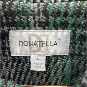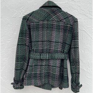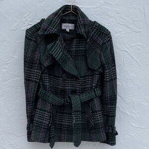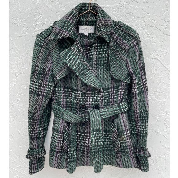 Donatella Womens Plaid Tie Waist Wool Pea Coat Green Sz Medium