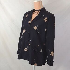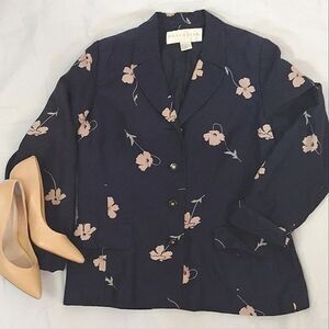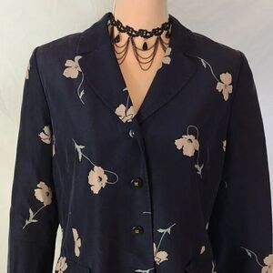 Doncaster 90s Navy Blue Floral Button Front Silk Blazer Jacket Size 12
