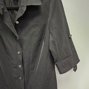 Chic black dress by Doncaster. Features button-up front. Short sleeves with roll-tab detail. Perfect for versatile styling.