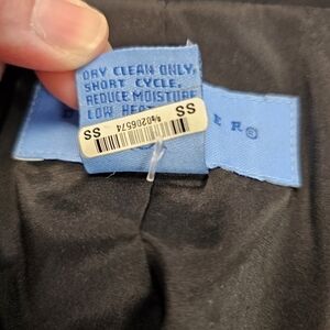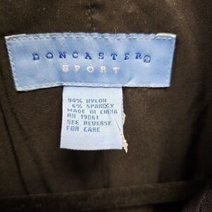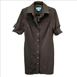 Chic black dress by Doncaster. Features button-up front. Short sleeves with roll-tab detail. Perfect for versatile styling.