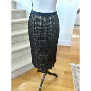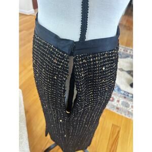 Excellent condition. Black boucle tweed, with gold metallic fiber and sequins through out. Multiple small flaps at hem, pencil straight skirt. Silk lining. Side zipper.