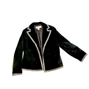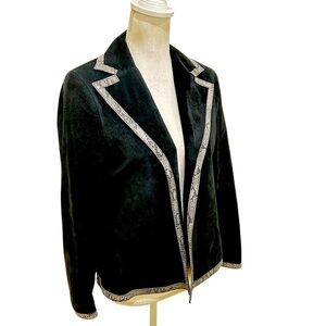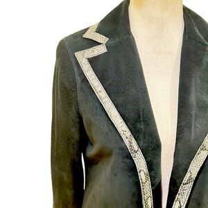 This elegant Doncaster 100% leather suede black open front lined blazer jacket features a stylish python print trim, perfect for adding a touch of sophistication to any outfit. Ideal for both casual and formal occasions. Euc