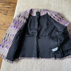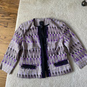 Beautiful Doncaster Collection Suit Jacket in Geometric Pattern in Black/Purple/Tan, Size 8