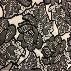 Doncaster collection brand skirt. Floral embroidered style pattern. Colors are black, gray, and white. It almost has a metallic look to it. Buttons and zips closed. Small slit in the back. Lined with black. Excellent condition. 50% nylon, 43% acrylic and 7% spandex. Length is appx 20 inches. Waist lying flat across is appx 16.5 inches.