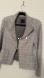 This sophisticated gray blazer features a tailored fit and a textured fabric with a subtle sequin and geometric design. Lined.  Gray silver color.   Silver tone clasp hook in the middle.   The notched lapels add a classic touch, making it a versatile choice for various occasions.