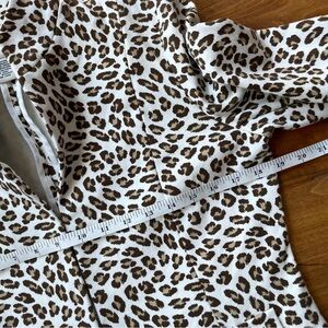 Stylish leopard print jacket for women, perfect for adding a touch of wild elegance to your wardrobe. Features a chic design that pairs well with any outfit. Classic style. Hook and eye closure. Two front patch pockets. Unlined. Cotton spandex blend for comfort and stretch. Three quarter length sleeves with slit vents in back. Runs a bit small. Gently preowned. See photos for details.