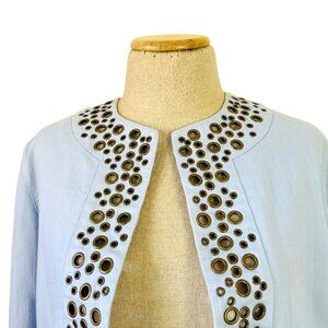 Elegant and modern light blue jacket featuring intricate grommet embellishments. A versatile layering piece for a polished, stylish appearance.