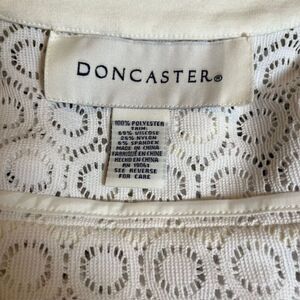 Doncaster Ladies White Lacy Crochet Look Zip Up Jacket. Excellent condition! See photos for details and measurements. Great for over tank or dress, vacation, cruise, spring, summer, brunch, tea, tennis, sundress,