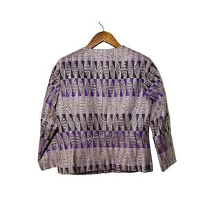 The perfect addition to your wardrobe. Fashion-forward jacket with elevated details fringe look on the small functional pockets and along the front with the black fabric covered buttons. The shades of dark and purple make this blazer pop pair with black trousers for work day or wear with your favorite denim for causal fun look.