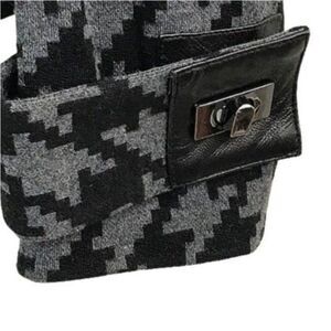 Features: large houndstooth print, 1 twist lock closure with matching trim and matching cuffs, wool blend, comfortable, business, career, professional, office to dinner, versatile- wear to work or on a night out, classic, timeless, celeb style