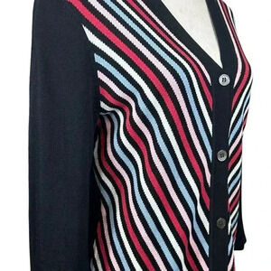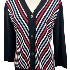 Doncaster sweater. Cardigan style. Buttons on front. Angled stripes. Multi colored. Long sleeves