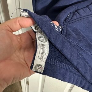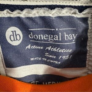 Really nice heavyweight Donegal Bay Syracuse University sweatshirt, size medium. Lace up detail at v-neck. 80% cotton/20% polyester. Raw edge stripes on sleeves, kangaroo pockets, nice edging detail inside the garment and in the hood.