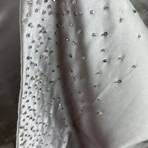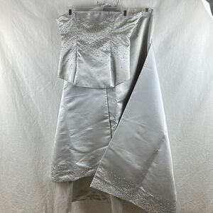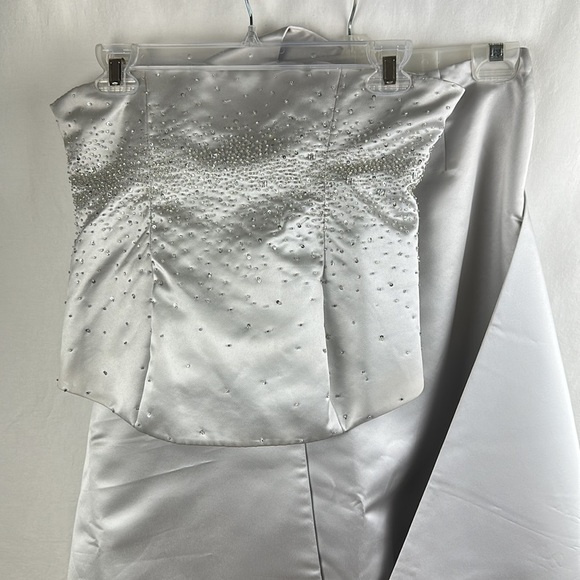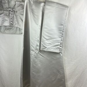 Donna Gray three-piece bustier, wrap, skirt set, size 6. Silky, shimmery silver/gray color. Bustier has crisscrossed tie in the back for custom fit. All pieces fully lined. Looks like it may have been worn once. Great for a wedding or other special occasion.