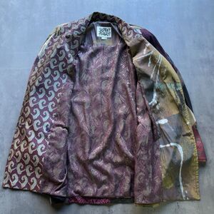 Stunning Donna Jessica patchwork blazer a true wearable art piece. Made from a mix of silky jacquard, abstract prints, paisley, geometric blocks and rich jewel-tone fabrics. Every panel is unique, giving this jacket a gallery-level look. Fully lined with more intricate patterns, button front, and a relaxed drapey fit. A rare find from a boutique designer known for NYC/Boston/Tokyo artwear.