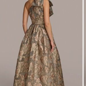 Stunning metallic one-shoulder gown with a beautiful pattern. Perfect for formal events.