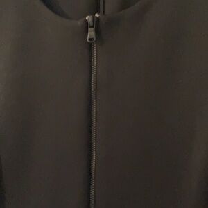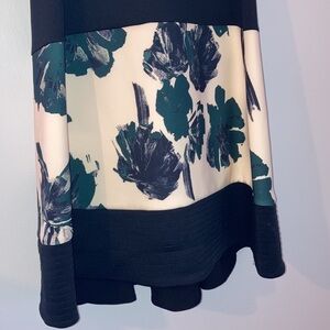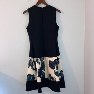 Size 6 (check measurements carefully) Donna Karan sleeveless dress. Black bodice. Exposed front & rear zippers. Ivory band with bold green & black floral print. Wide hem with stitching detail.
