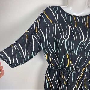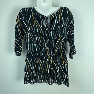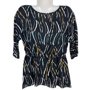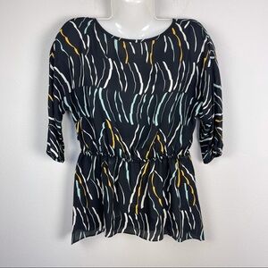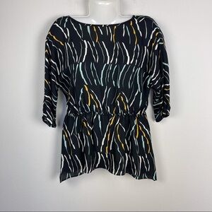 Like new Donna Karan New York asymmetrical hem elastic waistline tunic, elastic cuffs, 3/4 sleeve length, black with colorful print throughout. Size S.