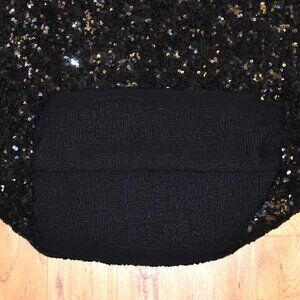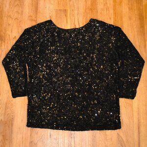 Long sleeve pullover shirt covered in sequins by Donna Karan. Size Large and 100% wool. In excellent condition with no holes or stains. Only flaw is a section of the bottom hem has come undone (see pic). Comes from a smoke free home.