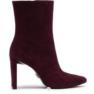 Suede creates a classic pointed toe boot that is finished with a trendy flat heel.