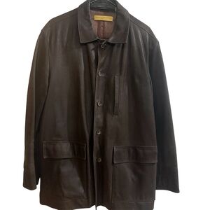 Sophisticated leather jacket with a sleek design. Features a button-up front and practical pockets. Ideal for a refined look.