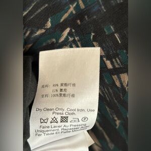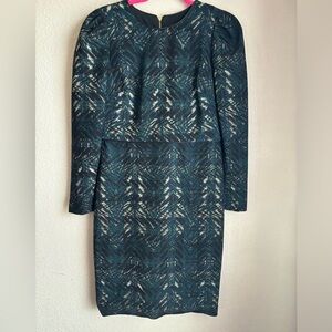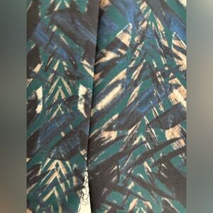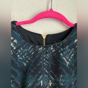 Abstract leaf like print in a dark green, beige, black, and blue pattern. Sturdy scuba knit with braided leather trim. 3/4 sleeves. Fully Lined with back zipper.