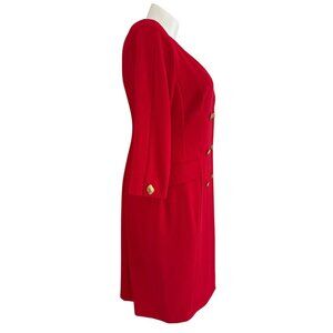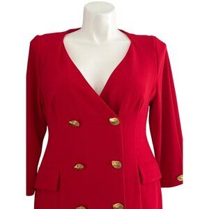 This tailored red dress features a double-breasted design with gold-tone buttons and a flattering V-neckline, ideal for refined and polished occasions.