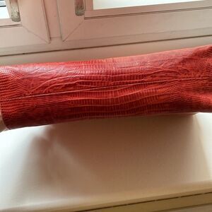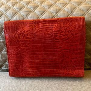 Donna Karen New York Vintage cosmetic bag. Red embossed leather, Velcro closure, removable terry cloth lining. Made in Italy.
