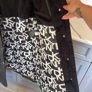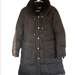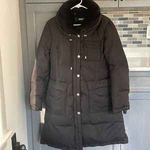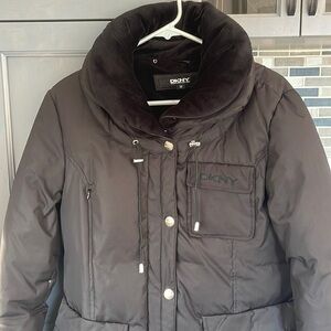 Gently use Donna Karan New York puffer three-quarter length jacket black in great condition the strings are a little worn out but can be repaired also the zipper could use a couple of stitches on the seam