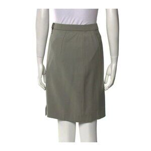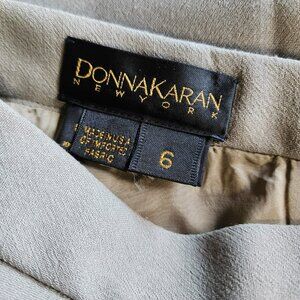 Classic Donna Karan wool skirt in a versatile grey hue. Features a tailored pencil silhouette, zip closure, and functional slit pockets—perfect for minimalist styling or elevated workwear.