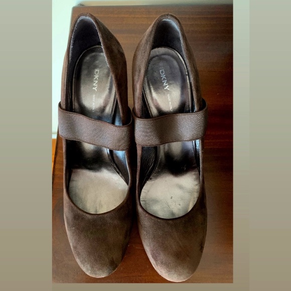 Donna Karan chocolate brown suede high heel, round toe, elastic front band in a size 9. Wore couple times. Like new. Comfortable, stylish with old time vintage period charm.