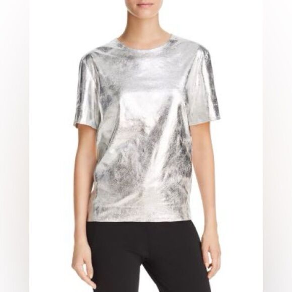 Elevate your wardrobe with this Donna Karan silver t-shirt, featuring a striking graphic design and a boxy silhouette. The short sleeves and metallic finish add a modern touch, making it a standout piece for any casual ensemble. Its reflective surface and loose fit offer both comfort and style.