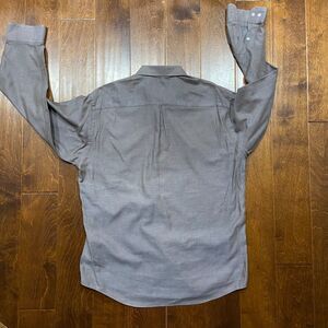 This men's size large Donna Karen Signature button front cotton gray dress shirt is pre-owned and in excellent condition. With long sleeves, this shirt is the perfect addition to any professional wardrobe.