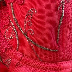 Vintage Donna L’oren beautiful red-orange with embroidered flowers. Satin and lace with detachable garter belts.Built on boning on corset. keyhole on back side of panty. stunning, new without tags. Personal collection. Stored sealed in closet. Pristine condition, no sign’s of wear or flaws.