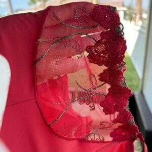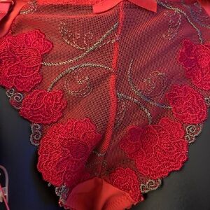 Vintage Donna L’oren beautiful red-orange with embroidered flowers. Satin and lace with detachable garter belts.Built on boning on corset. keyhole on back side of panty. stunning, new without tags. Personal collection. Stored sealed in closet. Pristine condition, no sign’s of wear or flaws.