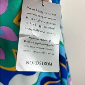 Pretty bold dress is fully lined. Long center back zipper.