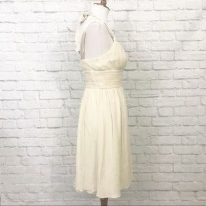 Excellent Condition Donna Morgan Ivory Silk Chiffon Dress. Features a figure flattering waist, unique ribbon straps that tie at the neck, hidden side zip closure, and padded bra. Fully lined. This dress is stunning and flows beautifully. Perfect for so many formal occasions. Would make the most gorgeous beach wedding dress. Tag size 6. Approximate measurements: bust 35”, waist 28”, outseam length (measured bottom of empire waist to hem) 22”. Bundle and Save!
