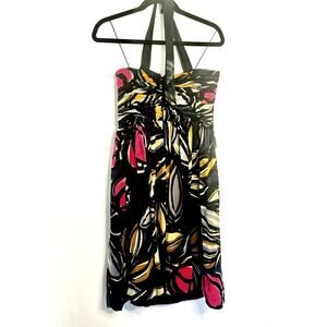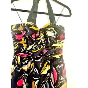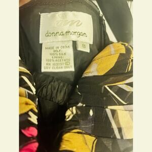 Donna Morgan 100% Silk Cocktail Dress. Size 8. Strapless with an added black strap that can be tied into a bow around the back of the neck. Colors include black, navy blue and pink. Gently Used.