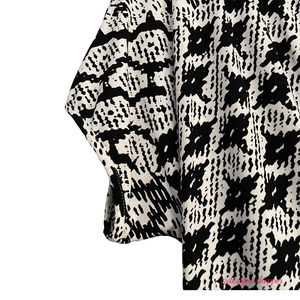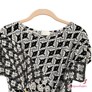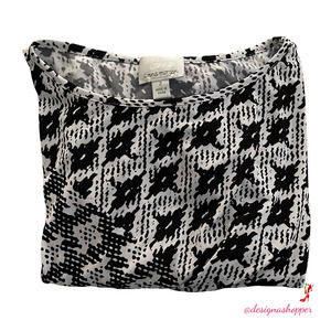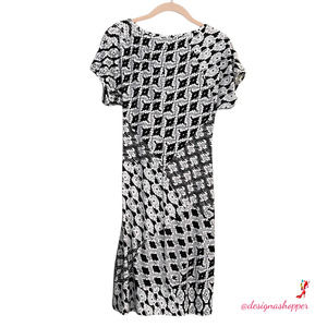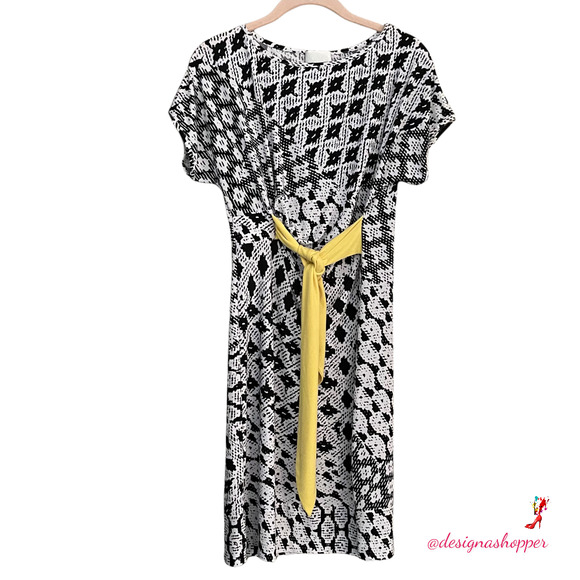 Cute dress in an abstract design by Donna Morgan. Black and white unique design with yellow tie accent. Scoop neck and cap sleeves makes this comfortable dress perfect for work, school, church or practically any function. There is no fiber tag, but I am "assuming" it is some sort of Poly blend. Size 2