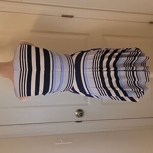 Donna Morgan Size 4 Dark and Light blue and beige striped dress. Sleeveless, fitted waist with a full skirt. 95% Polyester, 5% Spandex. Very comfy! Cute with sandals for a casual day or can be dressed up for the office! Never Worn! Excellent Condition!