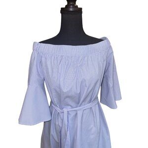 Donna Morgan Blue White Striped Off-Shoulder Dress Bell Sleeves Waist Tie Size 8