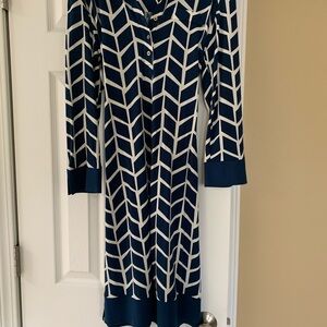 This elegant Donna Morgan dress features a sophisticated cowl neck and long cuffed sleeves, perfect for both work and casual occasions. The sheath style offers a flattering fit, while the blue and white color scheme adds a touch of classic charm.